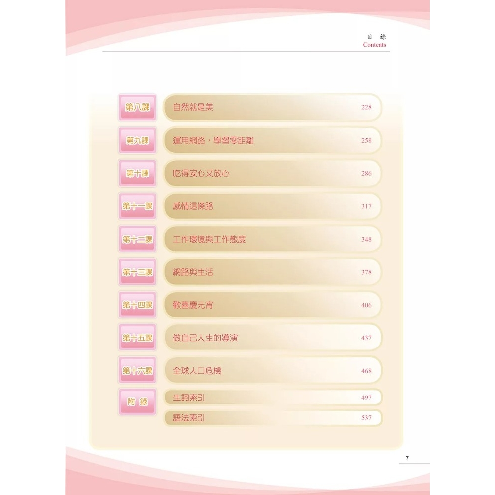 本教材共分七冊,依據 CEFR 的領域(domain)、情境(situation)與溝通主題(themes)三個面向,規劃出 16 個領域主題。除第一冊增加學前單元外,各冊皆為 16 課。七冊教材每冊 16 課的領域主題安排皆相同。每一個主題在不同冊數皆有螺旋式遞進與圓錐形上升的展現,包括詞彙的增加、語法的提升、主題的擴大等。十六大主題羅列如下: