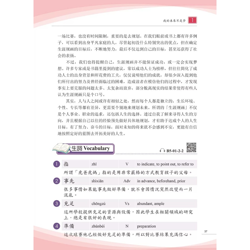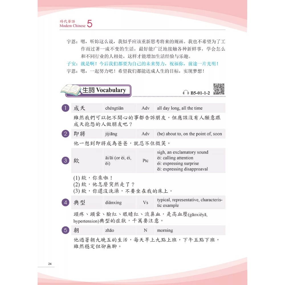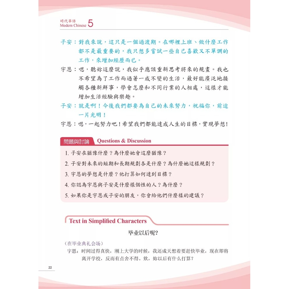 本冊課本以「i+1」學習理論為基礎,除逐課增加詞彙的深度與廣度外,也納入考量詞彙日常使用的頻率及用法,協助教師與學習者在課前課後有更多情境輔助參與練習。語法說明承接前四冊語法,更進一步對照比較,另外亦著重強化口說與書寫的靈活應用。語法例句精選課文內容,凸顯語境與語意的準確性,並提供螺旋式練習,題型多元,涵蓋多種情境以對話、改寫、完成句子等題型,兼顧口語與書面表達。課室活動強調溝通與任務導向,包含調查、角色扮演、辯論等多樣形式,促進學習參與語言實踐,是銜接B2+與C1的關鍵教材。
