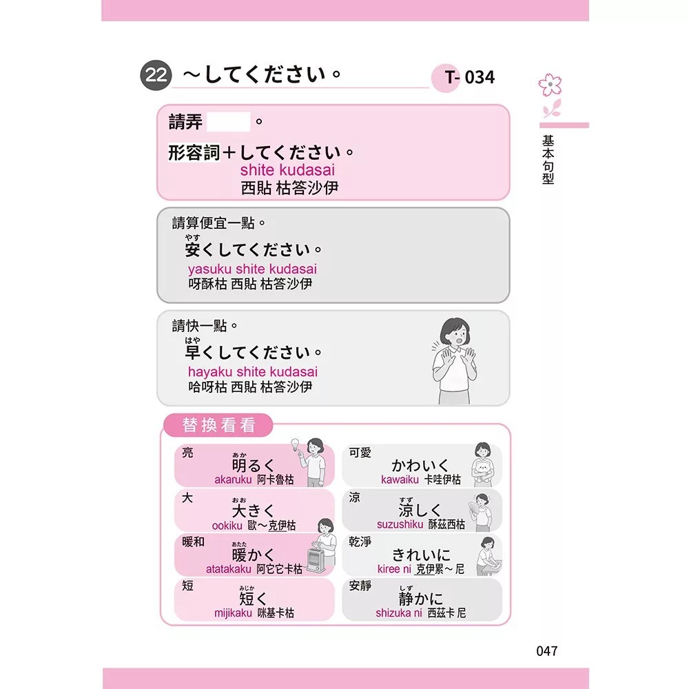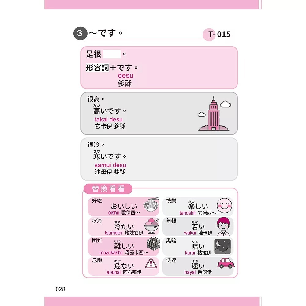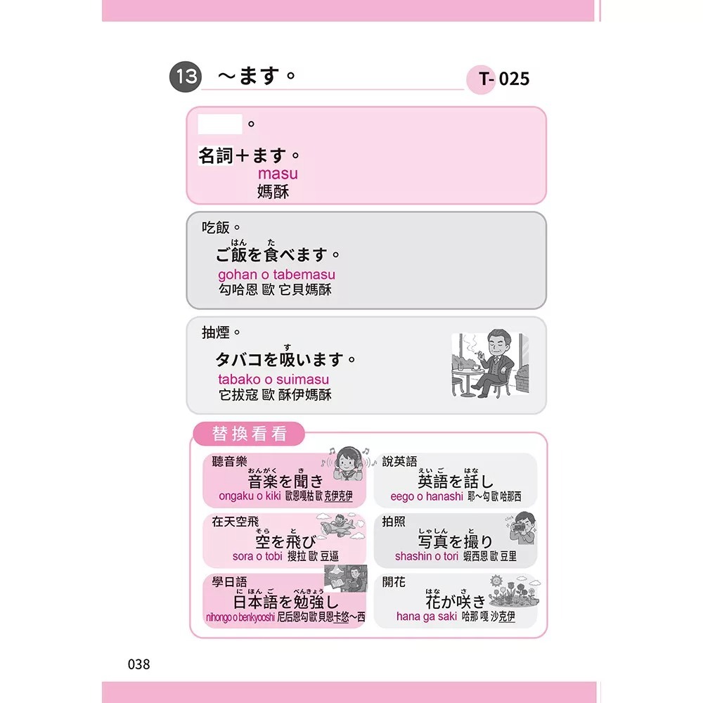 每個情境句下方,直接附上「單字替換表」。點餐時,把「牛肉」換成「豬肉」,把「這一個」換成「那一個」,學一句等於會十句,瞬間溜出一串流利日語。